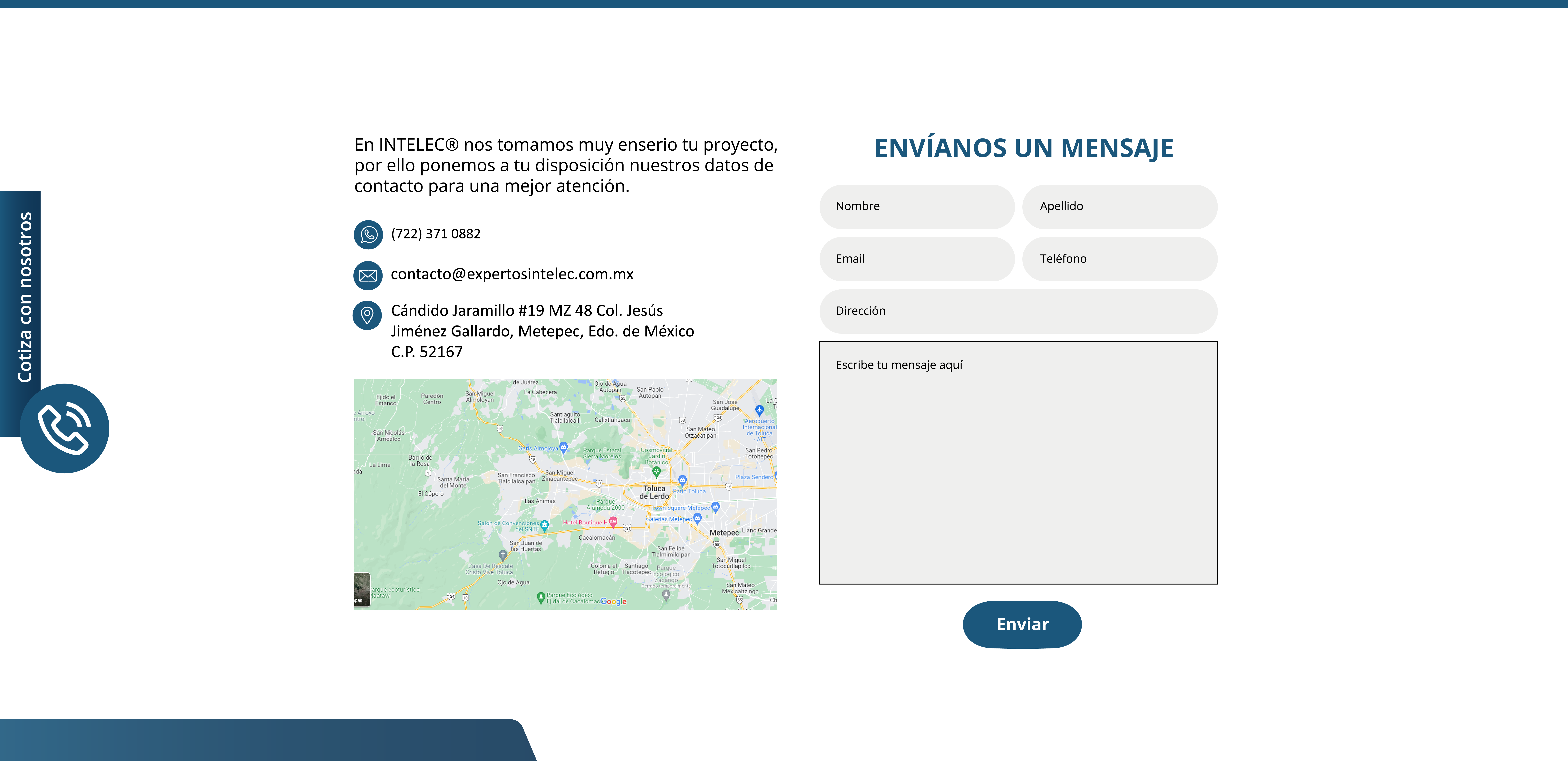 En INTELEC® nos tomamos muy enserio tu proyecto, por ello ponemos a tu disposición nuestros datos de contacto para una mejor atención.